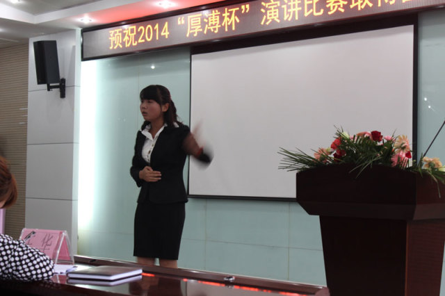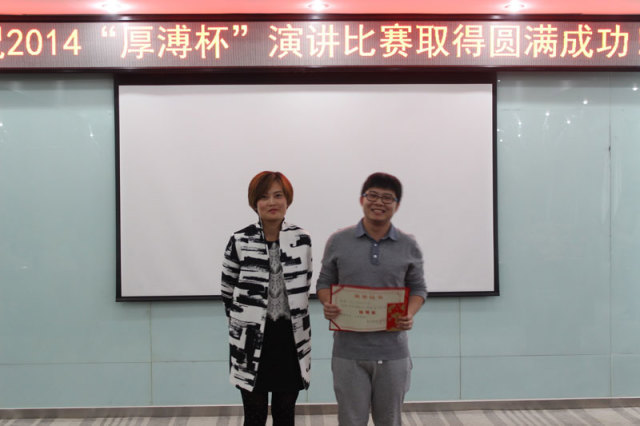 2014年10月31日,“厚溥杯”演講比賽決賽如期在光谷軟件園C6棟109多功能會(huì)議廳舉行。評(píng)委會(huì)由武漢景寧人力資源服務(wù)有限公司、武漢厚溥教育科技有限公司專家及各高校教務(wù)相關(guān)領(lǐng)導(dǎo)組成,通過嚴(yán)密的賽制,最終決出特等獎(jiǎng)1名、一等獎(jiǎng)3名、二等獎(jiǎng)5名、優(yōu)秀獎(jiǎng)8名,而優(yōu)秀指導(dǎo)老師則被湖北三峽職業(yè)技術(shù)學(xué)院劉靚老師獲得。