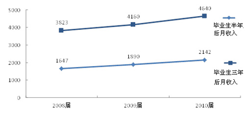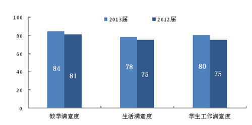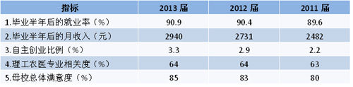 報告顯示,畢業生就業率持續上升,2013屆畢業生半年后的就業率為90.9%,比2012屆上升0.5個百分點。月收入持續增長,“跑贏”通貨膨脹,2013屆畢業生半年后月收入為2940元,比2012屆增長7.7%。自主創業比例為3.3%,比兩年前的2.2%提高了50%。畢業生專業相關度為64%,與前兩年基本持平。畢業生對母校的滿意度持續上升,2013屆的滿意度為85%,比2012屆上升2個百分點。(見表1)