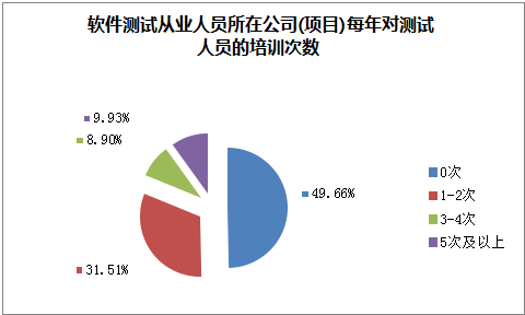 然而,在被調(diào)查者所在公司中,測試人員與開發(fā)人員的比例在1:4及以上的高達(dá)55.13%。在這些公司中,49.66%的公司每年對測試人員進(jìn)行的培訓(xùn)次數(shù)為0。也就是說,將近一半的軟件測試人員在工作后沒有進(jìn)行培訓(xùn)學(xué)習(xí)的機(jī)會,這就要求想從事軟件測試的人員在入職前培訓(xùn)相關(guān)的技能,確保工作可以順利開展。